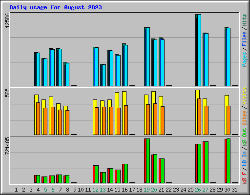 | Day | Hits | Files | Pages | Visits | Sites | kB F | kB In | kB Out | ||||||||