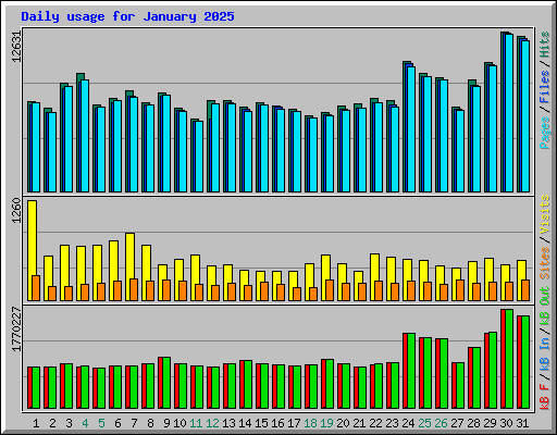 | Day | Hits | Files | Pages | Visits | Sites | kB F | kB In | kB Out | ||||||||